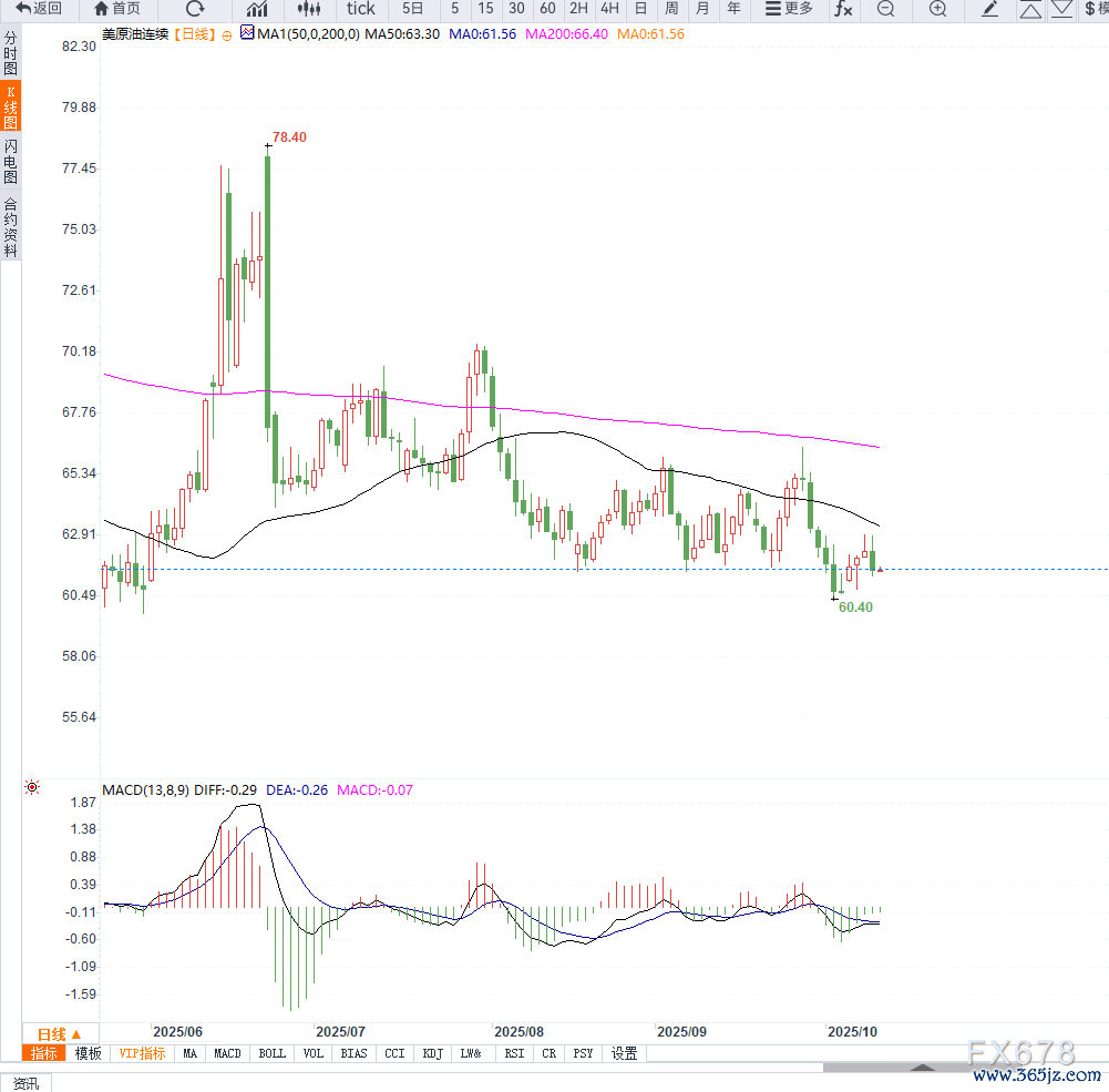 从时期图形来看,WTI日线显露价钱自9月中旬高点67.40好意思元/桶以来执续走低,当今初始在61好意思元救济区间近邻。K线花样联贯收出小阴线,反馈出市集在低位轰动整理,买盘意愿不及。